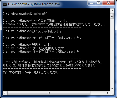 ダウンロードしたファイルをダブルクリックしてください。コマンドプロンプトが起動し、DisplayLinkManagerサービスを再起動します。